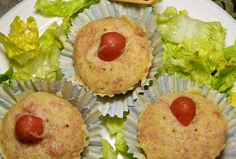 Vierte la masa en los moldes de magdalenas 3 tercios, pon el extremo de la salchichas, que sobresalgan.