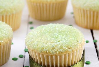 En un cuenco mezclaremos los ingredientes secos, la harina, la levadura (ambas tamizadas), el azúcar y la ralladura de limón. En otro cuenco mezclaremos los ingredientes húmedos, los huevos, el yogur, la mantequilla derretida pero fría y el zumo de limón. Juntaremos ambas mezclas y las uniremos bien. Verteremos la masa en los moldes de papel, que previamente habremos puesto en un molde rígido (para evitar que nos ensachen) y los hornearemos a 180º unos 30 minutos. Dejaremos enfriar en rejilla hasta que entibien.Para hacer la cobertura, teñiremos el azúcar con una gotas de colorante que más nos guste (yo lo hice verde mezclando el amarillo y el azul). Para teñir el azúcar, lo meteremos en una bolsita de plástico y añadiremos el colorante, cerraremos la bolsa y agitaremos hasta que el azúcar se haya empapado del mismo y haya tomado el color deseado (cuanto más colorante, más intensidad de color). Posteriormente lo extendermos en un plato y dejaremos que pierda humedad, removiéndolo de vez en cuando con la yema de los dedos. Una vez teñido y seco el azúcar procederemos a pincelar en cada muffin un poco de mantequilla derretida y rebozaremos el mismo por el azúcar coloreado.