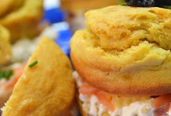 - Cuando los muffins se hayan enfriado, abrirlos por la mitad y rellenarlos con una cucharada de nata montada, un poco de salmón y un pelín de cebollino picado. Por último, cubrir el relleno con la tapa del muffin y rematar con unas huevas por encima.