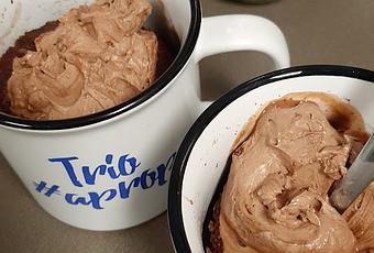 15 gr. de mantequilla (1c/s) 1/2 c/p de café instantáneo 5 gr. de cacao en polvo (1/2 c/p) 50 gr. de nata para montar 1/2 c/p de esencia de vainilla En la taza que se vaya a utilizar para el Mugcake, derretir en el microondas la mantequilla y el queso crema y mezclar bien. Añadir el huevo y mezclar.