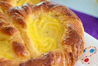 Preparación Comenzamos preparando la crema pastelera En un cazo ponemos casi toda la leche (dejamos como medio vaso para mezclar la maizena y las yemas), el azúcar, la vainilla y la corteza de naranja. Lo ponemos a fuego medio para que se vaya infusionando. En un vaso, colocamos la maizena, las yemas y la leche que reservamos. Mezclamos bien y colamos por si ha quedado algún grumo. Cuando la leche que tenemos en el cazo rompa a hervir, quitamos la vainilla y la corteza y echamos la mezcla que tenemos en el vaso. Revolvemos con una cuchara o con una varilla hasta que espese (no tarda ni un minuto). Volcamos la crema en un cuenco y tapamos con un film transparente (que esté en contacto con la crema) para que no se forme costra. Reservamos. Preparamos ahora la masa de bollería. En un vaso ponemos un poco de la leche y le damos un golpe de micro ondas. Deshacemos en ella la levadura En un bol ponemos el harina. Formamos un volcán con ella y añadimos todos los ingredientes , excepto la mantequilla. Echamos también la levadura que hemos deshecho con la leche.Mezclamos con una cuchara o con las manos, hasta que la masa ya se pueda trabajar en la meseta. Como siempre os digo cuando trabajamos con masas, la cantidad de harina es un poco orientativa, depende mucho del tamaño de los huevos. Espolvoreamos harina en la mesa y trabajamos la masa hasta que no se nos pegue en las manos. La colocamos en un plato y la dejamos reposar tapada unos 15 minutos. pasado este tiempo, volvemos a colocar en la mesa y trabajamos con el rodillo hasta formar un rectángulo. En la mitad inferior, colocamos la mantequilla (que llevará un buen rato fuera de la nevera) cortada en daditos. Plegamos la masa por la mitad , la sellamos un poco por todos los extremos para que no se salga la mantequilla y estiramos con el rodillo hasta formar un rectángulo. Este proceso es un poco engorroso, porque la mantequilla, que está blanda, insiste en salirse por todas partes, pero...¡Tened paciencia!. Doblamos en tres partes y la llevamos al frigorífico tapada durante 15 minutos. Sacamos del frigorífico, espolvoreamos la mesa con harina y volvemos a hacer lo mismo: rodillo-rectángulo-plegar en tres y... de nuevo al frigo durante 15 min. Así hay que hacerlo otras dos veces más. En total: 1 h y 15 min esperando por la masa.La última vez que la plegáis se deja reposar 30 min en el frigo.