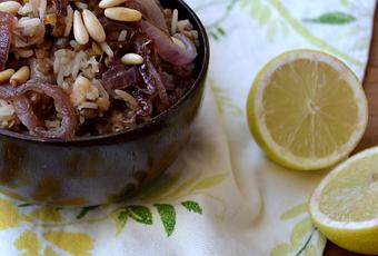 1- Preparamos las lentejas según instrucciones del fabricante, pero dejándolas un poquito duras. Les quitamos el líquido de la cocción y las enjuagamos. En una sartén grande ponemos el aceite y tostamos las semillas de comino con la pimienta hasta que comiencen a tostarse, sobre un minuto.2- Añadimos entonces las cebollas cortadas en aros, salpimentamos y cocinamos a fuego lento unos 15 min, hasta que quede caramelizada y de color oscuro, iremos removiendo de vez en cuando. Si quedara seco, añadiremos un poco de agua. Cuando comience a tostarse, retiramos la mitad de la cebolla y la ponemos sobre papel absorbente. Al resto le añadimos el comino el polvo, la cayena y la canela, volvemos al fuego durante un minuto. Removemos.3- Añadimos el arroz y removemos hasta que comience a tostarse, añadimos las lentejas y 600 ml. de agua. Llevamos a ebullición. Bajamos el fuego, tapamos y cocinamos removiendo de vez en cuando hasta que quede el agua consumida por completo y el arroz bien hecho. Dejamos reposar 5 min. Servimos y decoramos con la cebolla que hemos apartado antes y los piñones tostados y un buen chorro de limón.