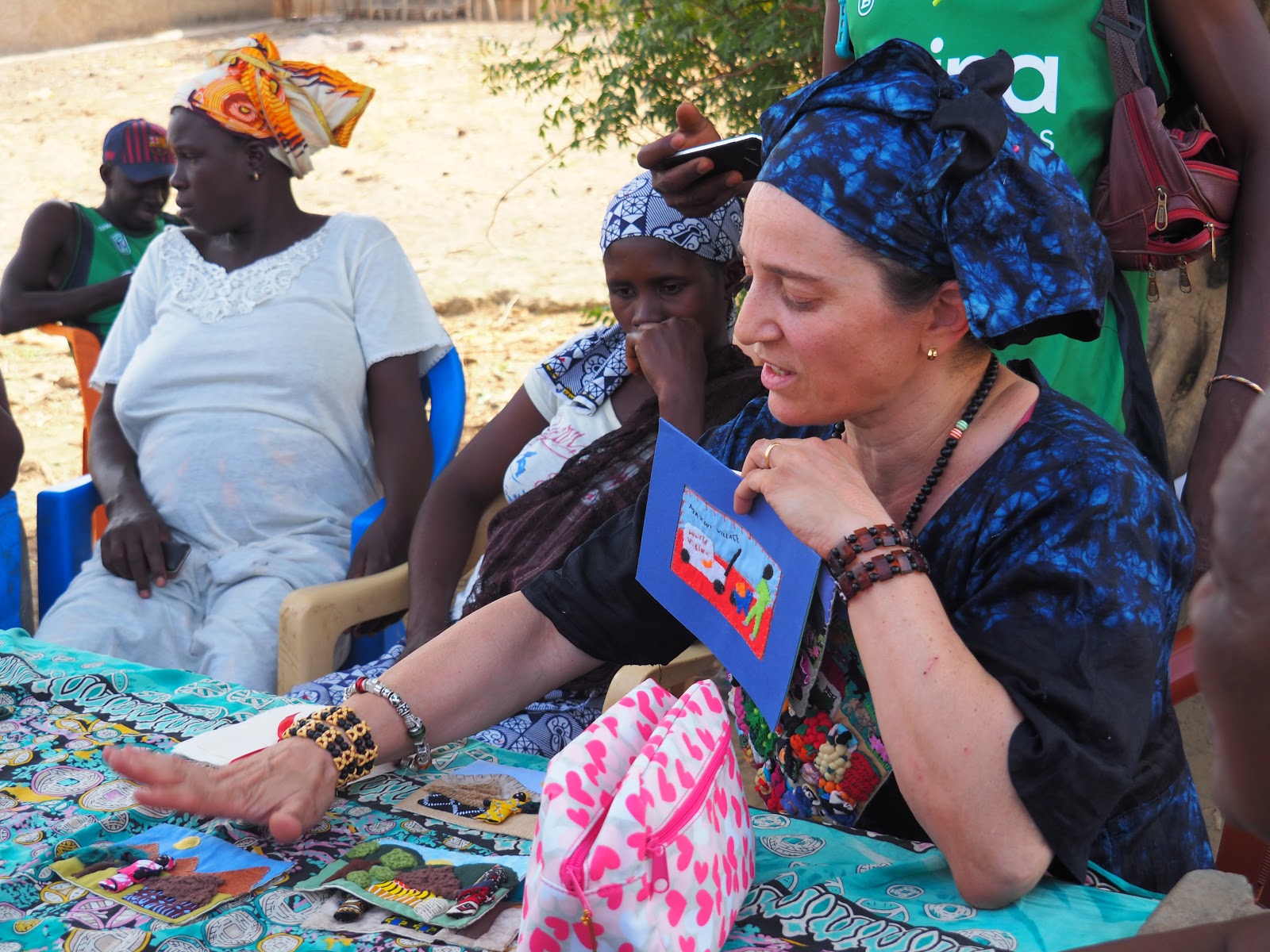 Expliqué que son las arpilleras, como surgieron y como creía yo que podían ayudarlas. Entonces se hizo la magia, estoy segura, a partir de ese instante todo fue fácil, muy fácil. No se interpuso entre nosotras ni el idioma (o mi francés estaba muy oxidado o algunas no lo dominaban mucho, por suerte apareció una traductora voluntaria), ni lo que sabían o no sabían ellas, ni lo que sabía o no sabía yo, todo fue fácil y sencillo, parecíamos "amigas de toda la vida". Y así, cada una hizo su muñeca, no teníamos suficientes agujas, pero no hicieron falta, ellas las hicieron con hilos y nudos, habían sólo 2 tijeras para todas y tampoco fue un problema, volaban de mano en mano entre risas y miradas de complicidad, algunas sabían coser, otras no y tampoco fue un problema, todas nos ayudábamos.Al día siguiente, tras subir y bajar a Iwol con mi arpillera "Yo tengo un pesebre africano" teníamos el segundo taller. Ni siquiera notábamos bajo nuestros pies el suelo polvoriento de Ibel, ni el calor a más de 40 grados nos detenía, solo hacíamos una cosa: vivir intensamente con todos los poros de la piel la compañía de ese grupo de mujeres coraje.