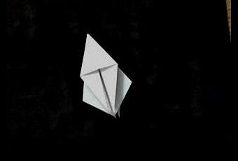 Ahora tenemos que plegar la punta que será la boca de la figura. Tenemos que abrir un poco la figura para que este doblez pase a travéz de ella. Pueden seguir la línea punteada. Lo que se tiene que tomar en cuenta aquí es que el pliegue se crea a partir del límite de la técnica ¨brazo largo¨, y debemos cuidar que tenga una buena distancia con respecto a la parte que serán los ojos para que tenga buena apariencia. Cambiando estas posiciones le darán una cara con proporciones diferentes.
