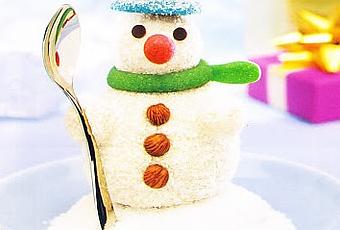 Los muñecos de mazapán lo elaboramos de la siguiente manera. Para hacer cuatro muñecos de nieve ponemos 250 ml. de agua y 1 kg. de azúcar al fuego en una cazuela hasta que se diluya y sin que llegue a hervir. Una vez disuelta, añadimos 250 gr. de almendras molidas, removiéndola bien para que no se nos hagan grumos. Dejamos enfriar el mazapán. Una vez frío y algo duro, formamos dos bolas de mazapán, una más pequeña que otra para hacer el cuerpo y la cabeza del muñeco. También hacemos otras dos bolitas más achatadas para formar los brazos. Reservamos un poco de mazapán por si queremos hacer bufandas y sombreros. Para cubrir estas formas podemos usar coco rallado o bien derretimos chocolate blanco al baño maría y cuando esté templado rebozamos con ayuda de dos cucharas las bolas y las dejamos cuajar. Para unir las partes, lo ideal es usar glucosa tibia a modo de pegamento. Otra opción es utilizar palillos de dientes, pero será más incómodo a la hora de comerse los muñequitos. Para colorear el sombrero y las bufandas podemos añadir colorante en el chocolate. Los botones, los ojos y la nariz los podemos hacer con frutos secos, frutos rojos o con glaseado con colorantes. Fuente: Entrechiquitines, Vinosyrecetas
