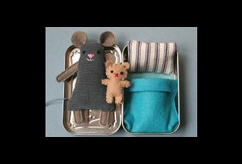 Las cajas de metal son camitas para los ratones, con sus sábanas, su colcha y su osito de peluche. Unos muñecos con todo lujo de detalles.