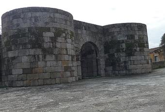Las murallas medievales son de planta ovalada, construidas sobre primitivos muros romanos, siendo rotas por cuatro puertas enfrentadas a los puntos cardinales. En el tramo norte se aprecian almenas piramidales. La puerta sur, en arco de medio punto, está flanqueada por una torre de planta cuadrada. En el lado oeste quedan restos de dos torres cuadradas y una más, semicircular. La “Porta do Sol” ya no existe, quedando marcada únicamente por la interrupción en la cortina del muro. La puerta norte es de doble arco de medio punto, flanqueada por dos torres de medio punto.