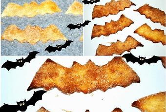 Precalentar el horno a 175ºC y preparar una bandeja forrándola con papel vegetal. Derretir la mantequilla y dejar enfriar ligeramenteen un cuenco. Mezclar bien el azúcarcon la canela y ponerlo en un plato.Disponer las tortillas de trigo sobre una tabla y cortar los murciélagos usando un cortador de galletas (o como en mi caso, una plantilla que me baje de Internet).Id mojando los murciélagos en la mantequilla derretida y rebozar en el azúcar, haciendo presión. Repetir con todos y colocar en la bandeja. Hornear durante unos 8-10 minutos, vigilando bien que no se quemen.Quedan crujientes y muy ricos.