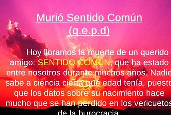 Hoy lloramos la muerte de un querido amigo: SENTIDO COMÚN, que ha estado entre nosotros durante muchos años. Nadie sabe a ciencia cierta que edad tenía, puesto que los datos sobre su nacimiento hace mucho que se han perdido en los vericuetos de la burocracia.