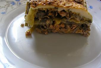 - En una fuente apta para horno y alta vamos a montar la musaka por capas. Untamos la fuente con aceite y empezamos con una capa de berenjenas que previamente hemos secado, una de carne, una de setas, nuevamente carne y así hasta terminar los ingredientes. Lo ideal es terminar con una de berenjenas.