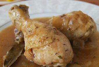 - Rebozamos ligeramente los muslitos de pollo en harina y ponemos a dorar en la sartén donde hemos hecho previamente la cebolla. Si es necesario, añadir un poquito más de aceite para dorar el pollo.