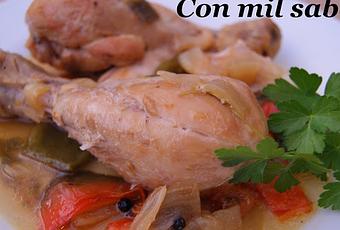 Preparación:Ponemos un poco de aceite de oliva a calentar y doramos ligeramente los muslitos de pollo, los sacamos y reservamos. En el mismo aceite sofreímos la cebolla y los pimientos (rojo y verdes) cortados en tiras, ponemos los ajos laminados y una vez dorado todo añadimos el tomate rallado, mezclamos todo bien dejamos hacer un poco y ponemos nuevamente los muslitos de pollo, sazonamos, añadimos la pimienta en grano,los taquitos de jamón y regamos con un poco de caldo de pollo. Dejamos cocer hasta que reduzca y el pollo está bien tierno.
