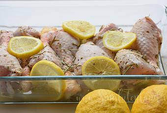 En una fuente para horno dejamos marinar los muslos, agregamos el zumo de los limones, un chorrito de vino blanco, añadimos el romero, orégano y salpimentamos al gusto. Reservamos durante 1 hora.