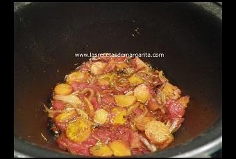 Pelamos el tomate y lo cortamos en cuadraditos (si no queremos entretenernos podemos añadir 3 cucharadas de tomate natural troceado), lo añadimos al sofrito junto con la zanahoria cortada en rodajas, el perejil picado y la piel del limón lavada. Mezclamos bien y añadimos ½ vaso de vino y dejamos cocer.