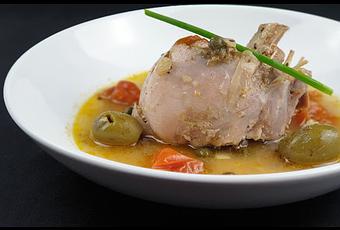Ingredientes para 2 personas:1 muslo de pavo; 10 aceitunas gordal sin hueso; 1 cucharada de alcaparras; Tomates cherry al gusto; Vino blanco seco; 1 cayena; Salvia Seca; Sal; Pimienta Negra;Aceite de Oliva; Agua.