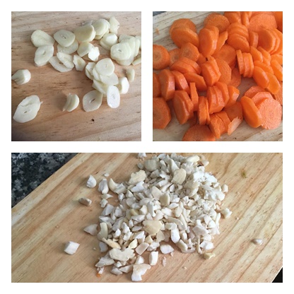 Pelamos la cebolla y la cortamos en trozos pequeños. Pelamos las patatas y cortamos en tacos pequeños. Pelamos la zanahoria y las cortamos en rodajas pequeñas. El pimiento lo cortamos en tiras.Pelamos los ajos y los cortamos en laminas. Picamos las almendras en trocitos pequeños. Echamos sal a los muslos de pavo.