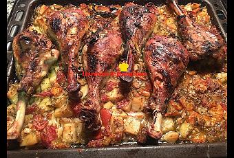 Pasados unos 30 o 40 minutos lo sacas del horno y le das la vuelta a los muslos, para que se doren bien por los dos lados y lo vuelves a introducir en el horno.