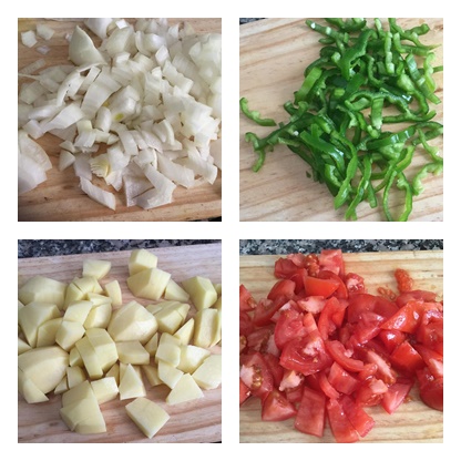 Pelamos la cebolla y la cortamos en trozos pequeños. Pelamos las patatas y cortamos en tacos pequeños. Pelamos la zanahoria y las cortamos en rodajas pequeñas. El pimiento lo cortamos en tiras.Pelamos los ajos y los cortamos en laminas. Picamos las almendras en trocitos pequeños. Echamos sal a los muslos de pavo.