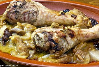 Si tenemos olla exprés, también podemos acelerar el proceso: doraremos entonces los muslos, pocharemos la cebolla, añadiremos ciruelas y ajos y dos vasos de agua o caldo de carne. Tapamos y cocemos 20 minutos. Quedará cocido, pero tampoco igual. Sigo defendiendo el fuego lento, sin añadir líquidos.