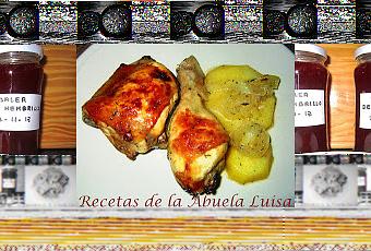 - Limpiamos el pollo, separamos los muslos de los sobremuslos (también podemos dejarlos juntos). - En un bol ponemos la mantequilla, la derretimos, añadimos el vino blanco, el zumo de los dos limones, el tomillo, la pimienta y la sal, mezclamos (en la medida que lo podamos mezclar). - Untamos el fondo de la fuente de horno con un poco del aderezo anterior. - Pelamos y cortamos las patatas en rodajas de un dedo de gruesas, las ponemos en el fondo de la fuente. - Cortamos la cebolla en juliana gruesa, la colocamos por encima de las patatas. - Sobre la cama de patatas y cebolla disponemos el pollo. - Regamos todo bien con el aderezo (si se ha solidificado lo calentamos un poquito en el microondas). - Metemos la fuente en el horno precalentado a 200ºC unos 50-60 minutos (el tiempo de horneado va a depender del tamaño del pollo y del horno). - Vamos dándole vuelta al pollo cada 15-20 minutos y lo rociamos con el jugo de la fuente, lo dejamos hasta que esté dorado. - Si vemos que se va quedando seco podemos añadirle algo de agua. - Hacemos una mezcla con las dos cucharadas de miel (si no tenemos de romero nos apañamos con la que tengamos) y una cucharada de agua, pintamos un lado, horneamos 5 minutos, damos la vuelta, pintamos el otro lado, horneamos otros 5 minutos y ya está listo para servir.