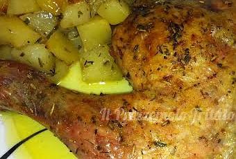 Mientras el pollo se macera lo primero que hacemos es preparar el caldo del pollo para asarlo, ponemos el agua, con la pastilla de caldo, el laurel y Perejil Tomillo y Romero y llevamos a ebullición, cuando empiece a cocer le añadimos unas gotas de Aceite de Oliva, mantenemos hirviendo 5 min. y apagamos. Pelamos las patatas y las cortamos en cuadraditos y reservamos. Sacamos los muslo del frigorífico, quitamos el film y metemos en el horno, previamente precalentado, la piel de los muslos estará hacia abajo, hornearemos unos 35 min. a 180ºCy pasado este tiempo los daremos la vuelta pondremos las patatas y volveremos a hornear mas o menos 30 min. o hasta que la piel este dorada, mientras horneamos el pollo iremos regando los muslos con el caldo que previamente habíamos preparado, eso si una vez pongamos la piel hacia arriba añadiremos caldo a la fuente pero no por encima de los muslos por que entonces la piel no quedaría crujiente.Es una receta deliciosa, fácil y sencilla, las patas van cogiendo todo el sabor del pollo y del caldo y están deliciosas.