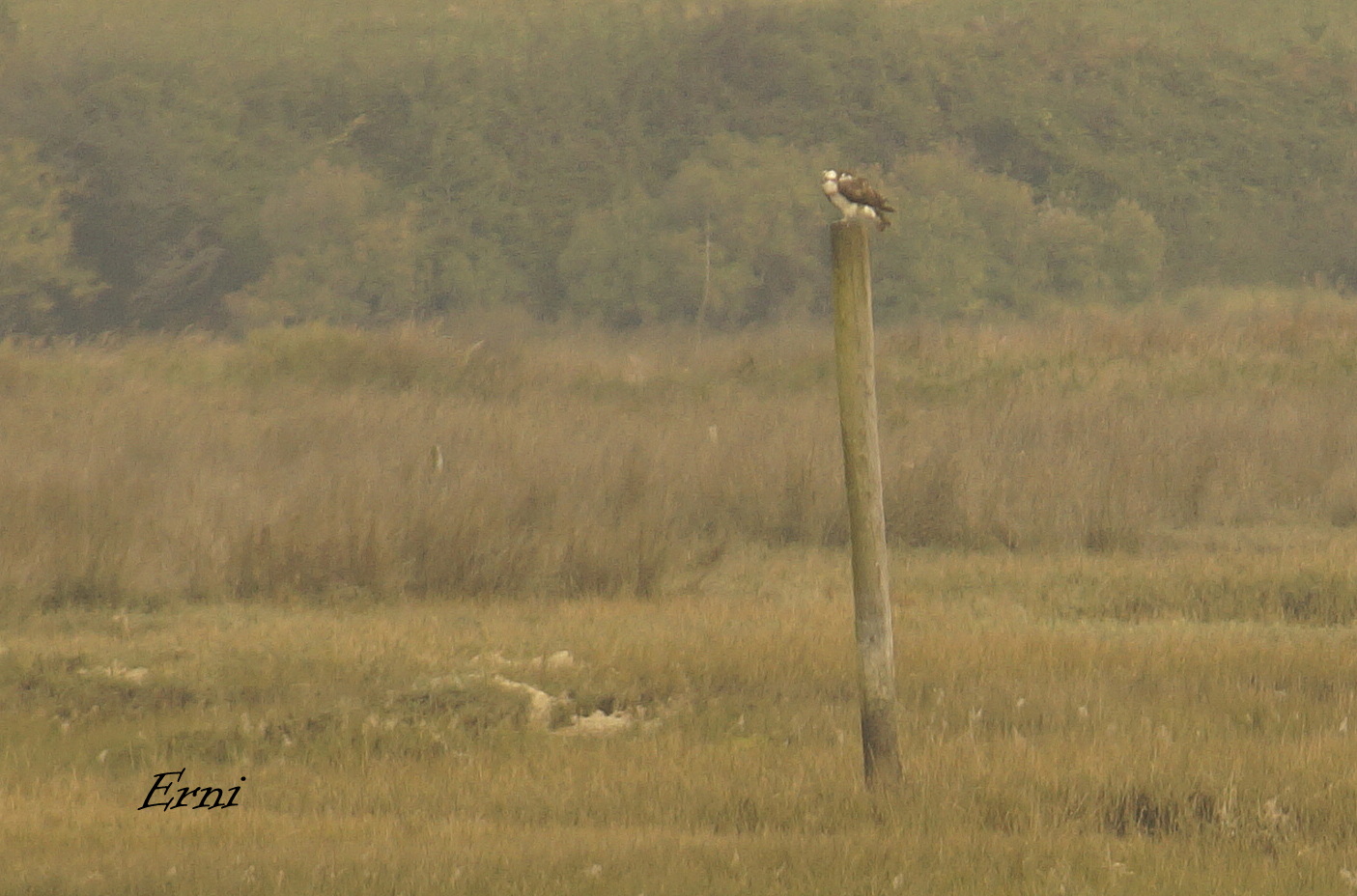 Y un águila pescadora en uno de los habituales posaderos... y, aunque muy lejos y con una mala foto, me parece adivinar algo en su espalda. Me da la impresión de que es el mismo ejemplar con "mochila" que ya observé el 4 de octubre en Colindres. A ver si alguien la puede ver de nuevo.