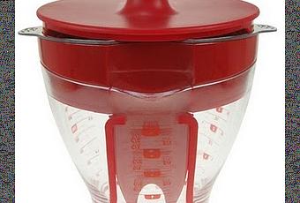 r de grasas tiene una extensión en su orilla que llega casi al fondo del recipiente para que al momento del vaciado quede el aceite dentro del contenedor; un colador para filtrar los trozos de alimento o impurezas de los líquidos, en color gris; el vaso transparente rotulado con medidas, que permite la visibilidad del contenido con capacidad de 1lt.; y una tapa en color rojo.