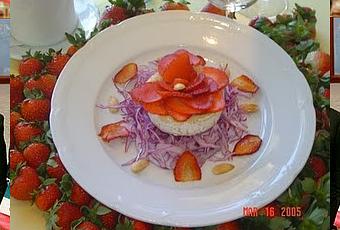 Hornea el queso Brie a 175° C hasta que se suavice por completo.  Con mucho cuidado, corta la costura superior del queso. Deséchala.  Cubre el queso con fresas, espolvorea azúcar por encima y decora con almendras.