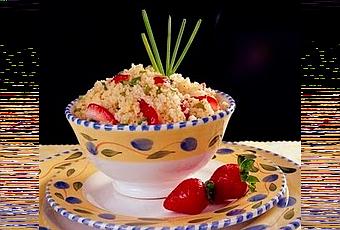 - 3 tazas de consomé de pollo desgrasado- 2 tazas de cous cous- 1 manojo de cebollín picado- sal- pimienta- 300 gramos de fresas en rebanadas- cebollín para adornar