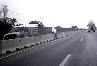Hace un tiempo andaba en una carretera que pasa por el extrarradio de la ciudad, una especie de circunvalación. Yo iba despacio, a poco mas de 100 Km/h. En eso alcancé a ver que una persona pasaba corriendo por plena autovía, el tío se puso a cruzar por el único sitio donde la malla que divide los sentidos de circulación está rota, misma que por lo visto ponen para que la gente no pase, pero que quieres, la gente la rompe y pasa. Justo tuve el tiempo de pillar la cámara y tomar la foto, el resultado es este: