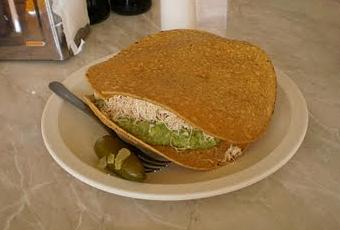 par de pedazos o tres, esta tostada partida se usará a modo de cuchara comestible, es decir, le pones parte del pollo, aguacate y crema en ella y te la vas comiendo. Hay gente que antes de comérsela revuelve el contenido de la tostada inferior para que quede todo bien mezclado, eso ya es cuestión de gustos, lo que sí es inevitable es que entre una "cucharada" y otra, se recomienda darle un pequeño mordisco al chile en vinagre que te viene incluido en el plato. Esta tostada también está en versión taco, en sí es exactamente igual, pero en lugar de ponerte unas tostadas duritas, te lo envuelven en una sola tortilla de maíz, pero los ingredientes son los mismos; y claro, al venir en taco la cantidad es algo menor, por lo que para llenar la tripa necesitarás un par de ellos.
