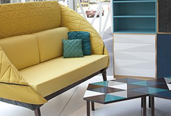 Superficies con cambios en los planos y detalles geométricos en el uso de textiles nos recuerdan los dobleces del papel característicos del origami. Estas teselaciones triangulares son la base del diseño de cada una de las piezas, en las que se ha buscado mantener la cualidad de modularidad, lo que permite personalizarlas de acuerdo a las necesidades de los clientes. El papel tiene un rol medular, ya que los sobrantes de la instalación se utilizaron para los insertos de papel en las patas de los muebles de la colección.