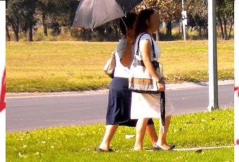 Si veis bien en la foto, no solo llevan el paraguas abierto, sino que la otra mujer tienen otro en la mano. La primera vez que lo vi dije, esta tía está como un cencerro, pero poco a poco lo vas entendiendo, y es que por un lado el sol no solo da un calor del copón, sino que hay días que el ambiente está mas seco que la cuenta bancaria del mexiñol, a tal grado que hasta pica en la piel; incluso sientes como que se te parte el pellejo; así que es menester el protegerse del sol.