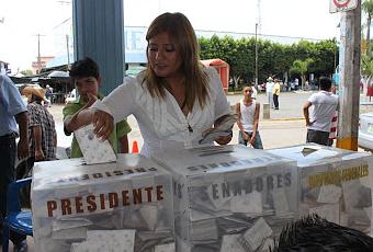 La candidata Fabiola Martínez deposita su voto en Omealca,