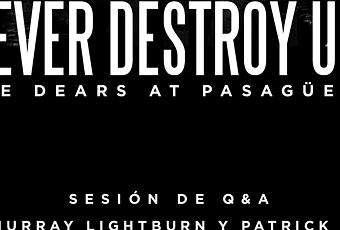 The Dears regresa a la ciudad de México. Murray Lightburn y Patrick Krief presentarán en el Cine Tonalá de la colonia Roma el documental Never Destroy Us: The Dears at Pasagüero incluyendo una sesión de Q&A y un íntimo show acústico para consentir a los afortunados asistentes.