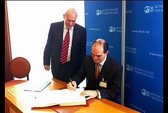 París, Francia, a 13 de octubre de 2011.- El día de hoy, el Director General del Instituto Mexicano del Seguro Social (IMSS), Daniel Karam, sostuvo una reunión de trabajo con el Secretario General de la Organización para la Cooperación y Desarrollo Económicos (OCDE), José Ángel Gurría, en donde se revisaron los avances de los trabajos que han desarrollado conjuntamente durante el año en curso.El pasado 13 de enero, el IMSS firmó un Memorándum de Entendimiento con la OCDE y la Comisión Federal de Competencia (CFC) y con ello se comprometió a adoptar e instrumentar los Lineamientos para combatir la colusión entre oferentes en licitaciones públicas. De ese modo, el IMSS se convirtió en la primera institución del mundo que suscribió dichas directrices que emanan de la OCDE.