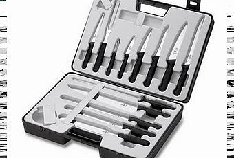 - Chaira redonda de 30cm.- Cuchillo para verduras 10cm.- Cuchillo deshuesador 13cm.- Cuchillo para charcutería 30cm.- Cuchillo embutidos aserrado 25cm.- Cuchillo para pescado 20cm.- Cuchillo para chef 16cm.- Cuchillo para chef 26cm.- Cuchillo utilitario aserrado 13cm.- Cuchillo utilitario 8cm.- Espátula de 24 cm.- Tenedor de carne de 15cm.- Pelapapas de doble filo 8cm.