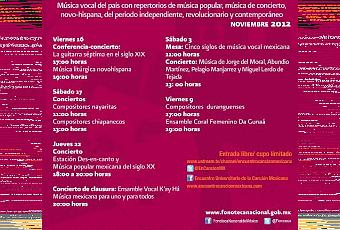 - Los días 3, 9, 16 y 17 de noviembre ofrecerá conciertos de música vocal de compositores duranguenses, nayaritas y chiapanecos.