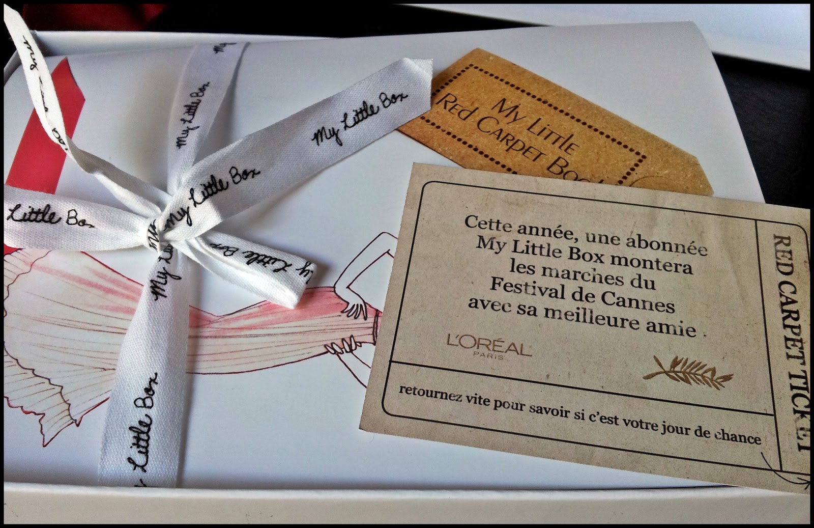 El motivo de esta caja es el festival de Cannes que comenzó el 16 de Mayo aquí en Francia y por ello se llama My Little Red Carpet box. Nada mas abrir la caja hay una tarjetita que me dice que una abonada podrá ir al festival de Cannes con su mejor amiga. Doy la vuelta a la tarjeta pero dice que como no sea prima de Leonardo di Caprio sienten anunciarme que no podré ir....