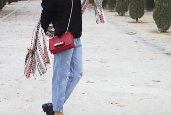 This time I did not get a raincoat or a jacket because I chose a fat black wool sweater with an ethnic print scarf above. I opted once again for the “red touch” that I love to wear these days matching my new red bag with studs. I’m totally in love with it now you know! hehehe. I also opted for the must have pants in any wardrobe: a pair of ripped boyfriend jeans On the other hand I wanted to show you my new and stylish oxfords in black with laces and XL ‘tongue’, what do you think about them? As accessories I only chose my new Pepito watch/bracelet.