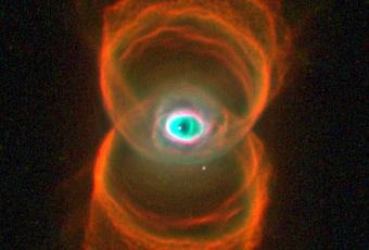 La arena del tiempo se acaba por la estrella central de esta nebulosa planetaria con forma de reloj de arena. Con el combustible nuclear agotado, esta breve y espectacular fase final de la vida de una estrella similar al Sol se produce cuando las capas exteriores son expulsadas y el núcleo se convierte en una enana blanca que se enfría y se desvanece. En 1995, los astrónomos emplearon el telescopio espacial Hubble para hacer una serie de fotografías de nebulosas planetarias , entre las que está esta. Aquí, los delicados anillos de gas brillante colorido ( nitrógeno -rojo, hidrógeno -verde y oxígeno -azul) perfilan las tenues paredes del reloj de arena . La nitidez sin precedentes de las imágenes del Telescopio Espacial Hubble ha revelado sorprendentes detalles del proceso de eyección de la nebulosa que contribuyen a resolver los enigmas de las complejas formas y simetrías de las nebulosas planetarias.