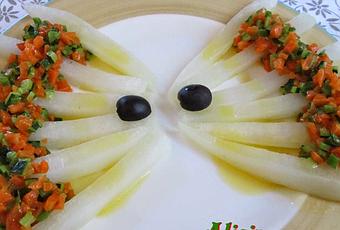 Cortamos cada loncha de nabo en dos, longitudinalmente, y después en bastones más o menos parejos, los colocamos en una fuente o plato de servir formando abanicos y repartimos el sofrito de verdura en el lugar donde se supone iría la tela del abanico. En la base y centro ponemos media aceituna. Servimos templados con la salsa de mantequilla por encima.