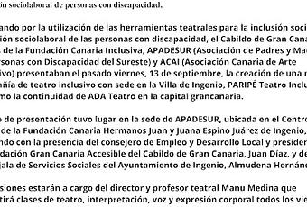 El Cabildo de Gran Canaria, con el apoyo de diversas organizaciones, presenta una nueva compañía que apuesta por el teatro como herramienta de inclusión y empleabilidadApostando por la utilización de las herramientas teatrales para la inclusión social e inserción sociolaboral de las personas con discapacidad, el Cabildo de Gran Canaria, a través de la Fundación Canaria Inclusiva, APADESUR (Asociación de Padres y Madres de Personas con Discapacidad del Sureste) y ACAI (Asociación Canaria de Arte Inclusivo) presentaban el pasado viernes, 13 de septiembre, la creación de una nueva compañía de teatro inclusivo con sede en la Villa de Ingenio, PARIPÉ Teatro Inclusivo, así como la continuidad de ADA Teatro en la capital grancanaria.El acto de presentación tuvo lugar en la sede de APADESUR, ubicada en el Centro Social de la Fundación Canaria Hermanos Juan y Juana Espino Juárez de Ingenio, contando con la presencia del consejero de Empleo y Desarrollo Local y presidente de la Fundación Gran Canaria Accesible del Cabildo de Gran Canaria, Juan Díaz, y de la concejala de Servicios Sociales del Ayuntamiento de Ingenio, Almudena Hernández.El consejero insular explicó cómo este proyecto comenzaba con ADA Teatro con la idea ahora de impulsarlo por toda la isla. “Se inició el pasado año en Las Palmas de Gran Canaria, cuyo resultado final se pudo disfrutar en el Temudas Fest y que se amplía este año al sureste con PARIPÉ, esperando el año que viene abarcar la zona norte”, aseguraba Díaz.La concejala Almudena Hernández mostró su alegría al ver que este proyecto se ha hecho realidad y al “ver que hay participación, aunque hacemos un llamamiento a las familias porque quedan plazas disponibles. Es precioso ver que la inclusión en el arte es posible”, expresó, para finalizar deseando lo mejor a todas las personas que participan y mostrando sus deseos de ver los resultados.Las sesiones estarán a cargo del director y profesor teatral Manu Medina que impartirá clases de teatro, interpretación, voz y expresión corporal todos los viernes a las 5 de la tarde con la intención de preparar para finales de año un espectáculo y llevarlo por diferentes localidades. La presentación contó también con la presencia de Susana Gyorko, presidenta de la Asociación Daño Cerebral Adquirido de Gran Canaria (Adacea), impulsora del proyecto, y de Pepa Santana en representación de APADESUR.Más de 25 alumnas y alumnos, futuros profesionales en el sector de las artes escénicas, se han sumado al proyecto respaldados por personal multidisciplinar y voluntariado. El objetivo es poner a la isla en el centro de atención mundial en cuanto a iniciativas de fomento del empleo a través del teatro, creando compañías estables de teatro que ofrezcan espectáculos formados enteramente por un elenco de personas con discapacidad para que cuenten con otra salida laboral y reduzcan su aislamiento social, fomentando su autonomía y autoestima.