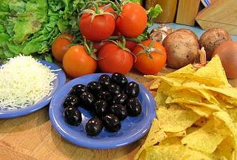 Ya tenemos todas las verduras listas y en la fuente. Ahora sencillamente las mezclamos bien con la ayuda del cuchillo que hemos usado para cortarlas, de manera que queden entre los nachos.