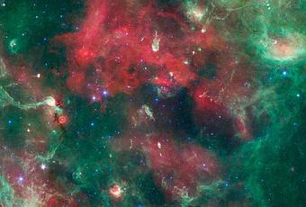 Un caldero burbujeante de nacimiento de estrellas se destaca en esta nueva imagen del telescopio espacial Spitzer. La luz infrarroja que no podemos ver con nuestros ojos ha sido codificado por colores, de manera que las longitudes de onda más cortas se muestran en azul y el más largo en rojo. El rango de longitud de onda media es de color verde. Las estrellas masivas han soplado burbujas o cavidades, en el polvo y el gas, un proceso violento que provoca tanto la muerte como el nacimiento de las estrellas.
