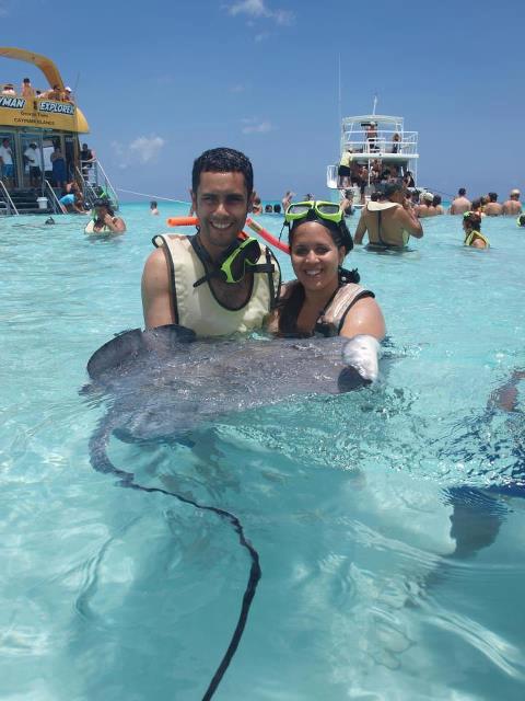 Luego de un tiempito de navegación, junto con un gran número de personas de distintas nacionalidades, llegamos a lo que parecía la boca de un antiguo volcán, con una profundidad de un metro más o menos en medio del mar Caribe.Varias lanchas, los turistas en el agua y muchas muchas rayas oscuras en medio de ellos, con forma circular al estilo de los platillos voladores de Independence day. Todos en nuestro barco se bajaron con gran entusiasmo, hombres, mujeres, niños… y allí bueno hay que bajar, despacito, sin moverse mucho y cuidando que esas siniestras manchas no se acerquen.