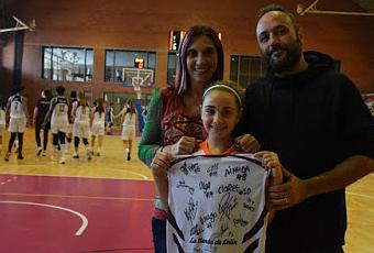 —Sí, Itziar fue de las primeras que me la firmó. Creo que la segunda fue Helena López. Mira, aquí están las de Marta Claret, Olga Ruano, Cristina Hurtado... —Ese 6... ¿Tienes el autógrafo de Silvia Domínguez también, Naiala?—¡Sí! –responde. —Y el de Laura Nicholls –sigue su madre. —¡Éste es el de Belén Arrojo! –continúa Naiala. —Tamara Abalde y María Conde –sigue Mariajo. —¡Rosó Buch! –se emociona la hija. —Nicole Romeo... –apunta la madre. —Éste es el autógrafo de Haley Dunham –sigue Naiala al descanso, al que se ha llegado con un 30-42 ante un Bàsquet Femení Sant Adrià que se acercó 30-35 con un triple de Laura Peña. La puesta en escena de Aina Ayuso reactivó a las locales. —La de Dunham ha sido la primera firma que tenemos de esta temporada –interviene Ramon. —¿Hoy pedirás algún autógrafo, Naiala? –le pregunto. —Alguno cogerá –responde el padre. —¿Verdad, Naiala? –sigue la madre. —No sé... [Risas] –confiesa la hija. —¿Maria Jerpersen...? –le pregunta Ramon. —Que no sé, papa. —¿Qué jugadora del Bàsquet Femení Sant Adrià te está gustando más? –le pregunto.—Pues... —A ella le gusta mucho Helena, ¿verdad? –interviene Mariajo. —Sí... Pero ya tengo su firma. A ver, a ver... ¿Qué autógrafos me faltan? –se pregunta Naiala. —Este año son casi todas nuevas –añade el padre. —Del año pasado te falta, por ejemplo, Mariam Coulibaly –le digo a la pequeña.
