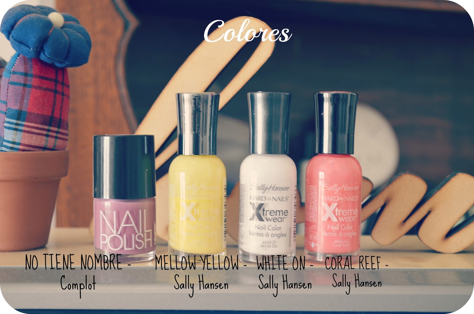 Como base use un color medio violeta de complot. No tiene nombre, no se por que. Y para las manchitas use Mellow Yellow, White On y Coral Reef todo de Sally Hansen. Para el contorno de las manchas, use el lápiz de Nail Art, también de Sally Hansen. Es un golazo ese lápiz.
