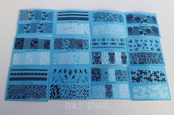 Este artículo se compone de un pack de 48pcs de water decals con infinidad de motivos, yo en concreto he usado el de Marilyn Monroe pero tenéis de encaje, de estrellas, huellas, flores, corazones, mariposas, pájaros, patos, de amor, etc. Os dejo unas imágenes y así veis mejor los diseños.