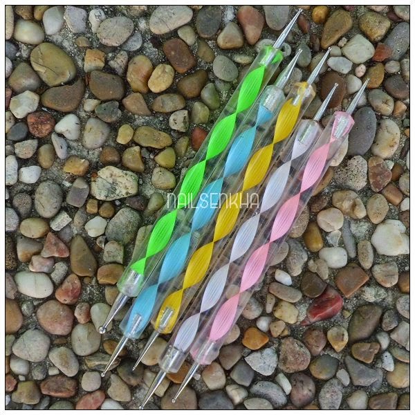 *Aplicamos nuestra capa base y cuando este bien seca pintamos todas las uñas excepto una que pintaremos de otro color y esperamos que seque.*En la única uña que he pintado de blanco con el color azul le hago en el medio en vertical una serie de puntos con el dotting tool y espero que seque bien para aplicar el top coat ya que sino se puede estropear nuestra manicura.